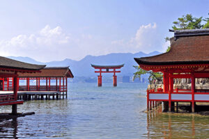 宮島を背後に海上に木造建築が立ち並ぶ神社。厳島神社を中心とする宮島の優れた景観は、日本三景のひとつに選ばれています。宝物館では、日本刀や兜鎧など、国宝を含む所蔵
